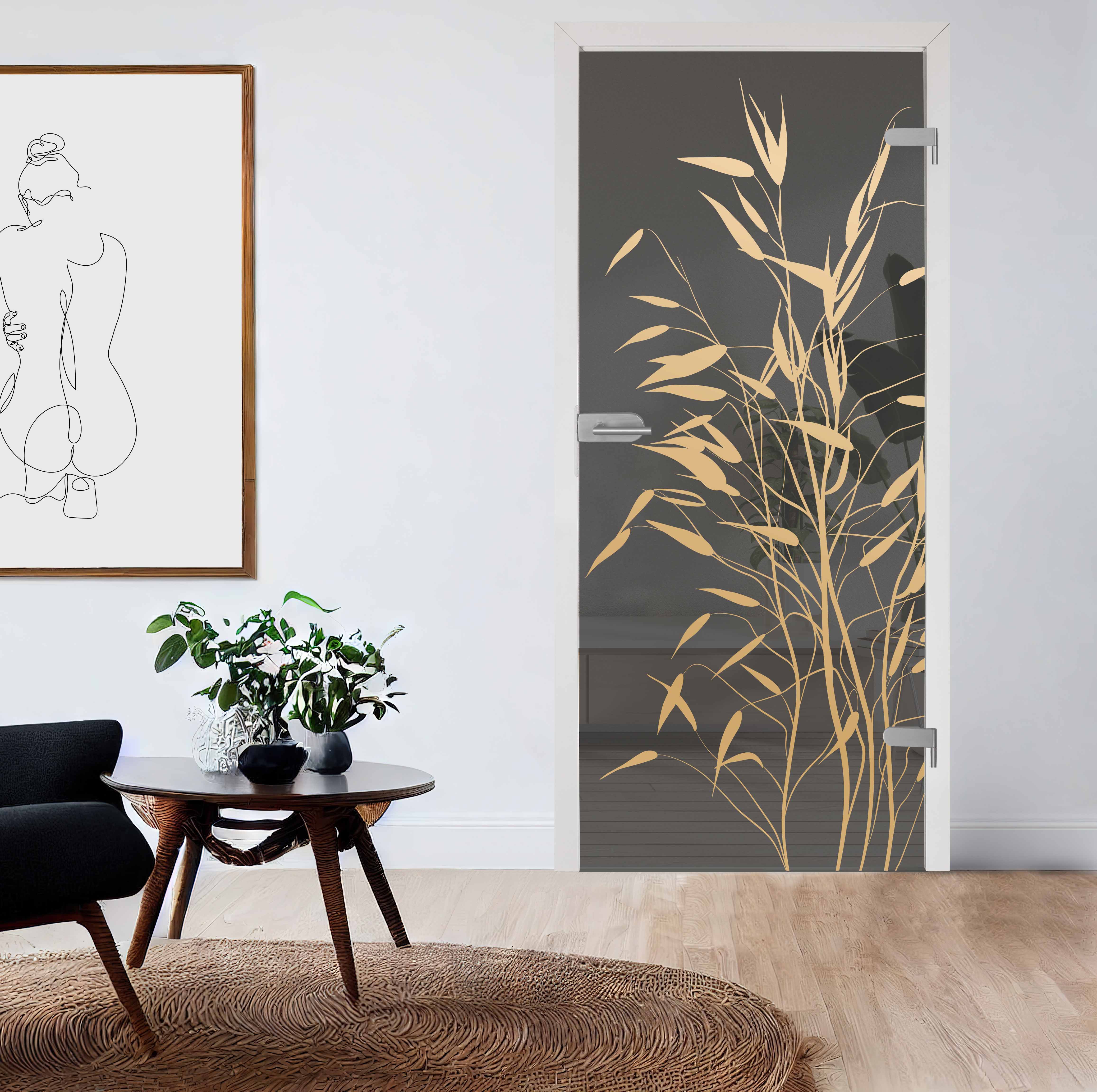Parsol Grau-Glas bringt einen Eyecatcher in den Raum. Grau ist ein absoluter Allrounder und wird durch die filigran gedruckten, goldenen Gräser ein edles Erscheinungsbild mit sich. Das Dekor wird in die Ansicht gedruckt, und ist so, im Ansichtsbereich, weich matt.  Durch die so gesetzten Akzente, entscheiden Sie sich mit dieser Glastür für Extravaganz und Individualität.