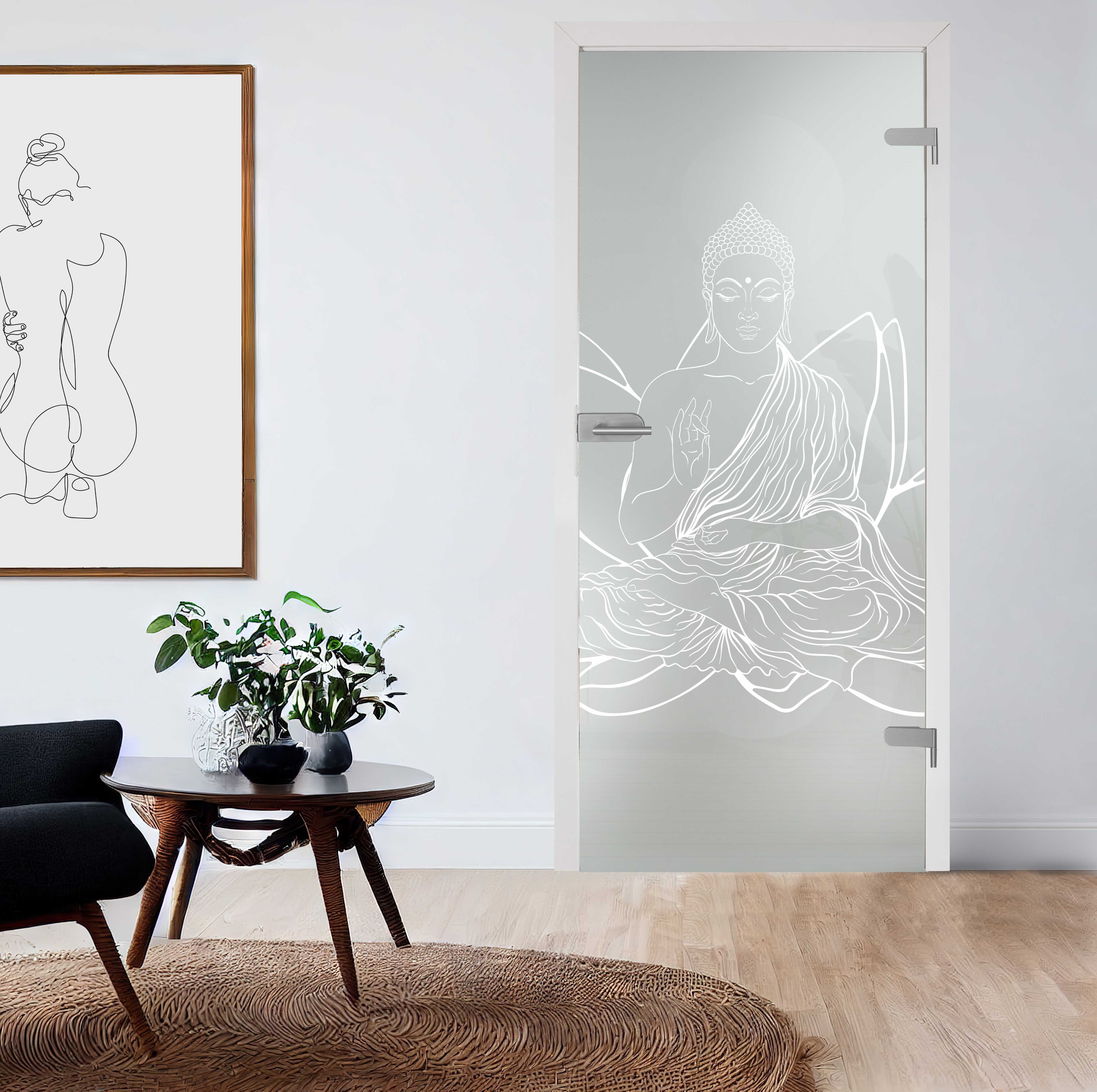 Buddha bedeutet "der Erwachte" oder "der Erleuchtete". Oftmals wird sein Abbild mit Entspannung und Ruhe verbunden. Somit bringt der sitzende Buddha in einer Lotusblüte mit Sicherheit viel Entspannung in Ihre 4 Wände. Gefertigt wird dieses Dekor mit einer präzisen Lasergravur welche mittels Laserstrahlen in das Glas gebrannt wird. Durch die so gesetzten Akzente, entscheiden Sie sich mit dieser Glastür für Extravaganz und Individualität.