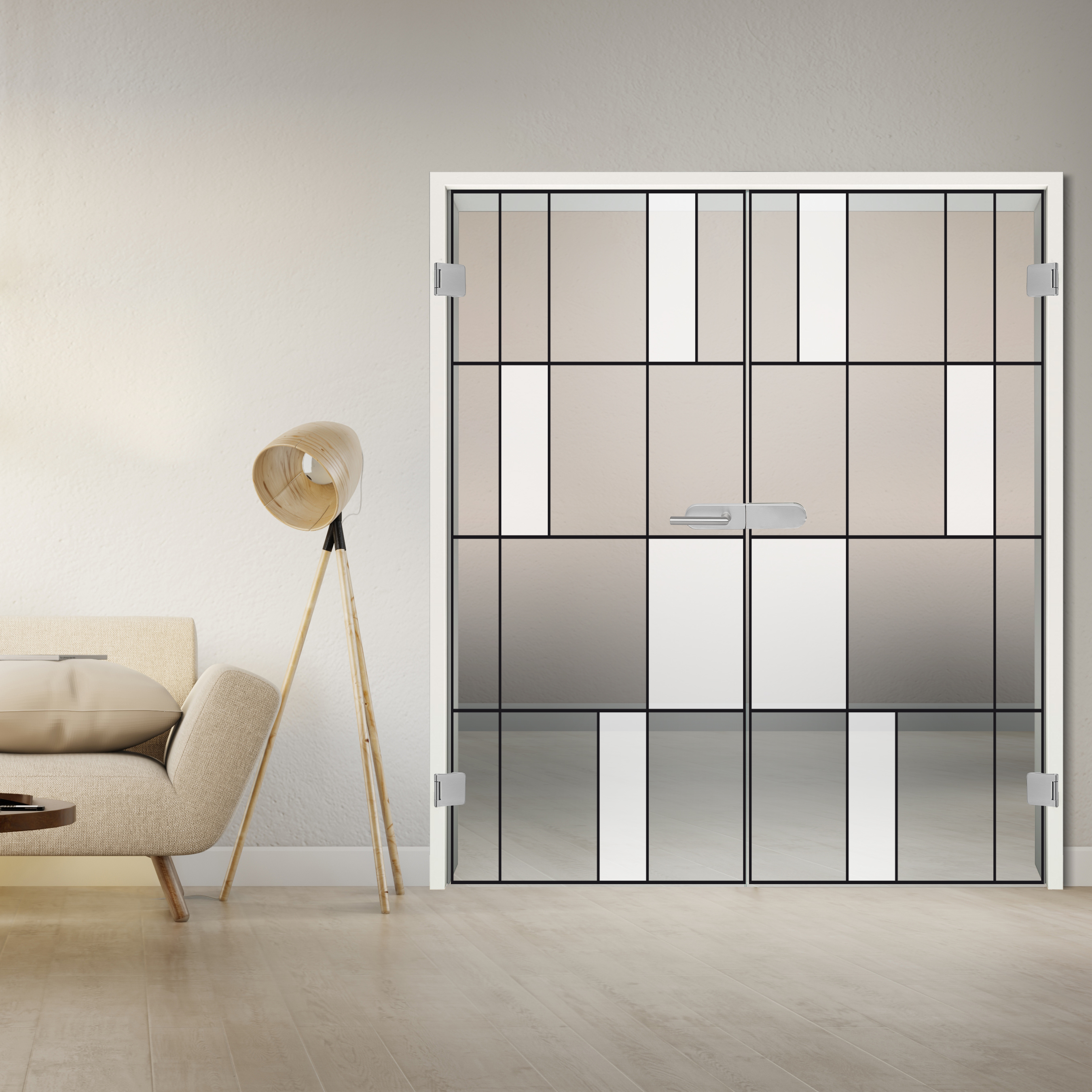 Entscheiden Sie sich für ein lichtdurchflutetes Wohnambiente: Unsere Produktdesigner haben mit dieser Doppelflügeltür ein modernes, ansprechendes Stilelement geschaffen, das Ihre vier Wände perfekt in Szene setzt.  Unsere Loftkollektion lässt keine Wünsche offen, ob symmetrisch oder nicht symmetrisch, schwarz oder weiß, mit roten Akzenten oder vielleicht doch nur weiße Akzente? Bei uns finden Sie die passende Lofttür für Ihr Zuhause. Dabei muss dieses nicht einmal ein Loft sein! Das Dekor wird in die Ansicht der Tür gedruckt und erhält so einen matt-Effekt welcher den Loft-Effekt verstärkt.