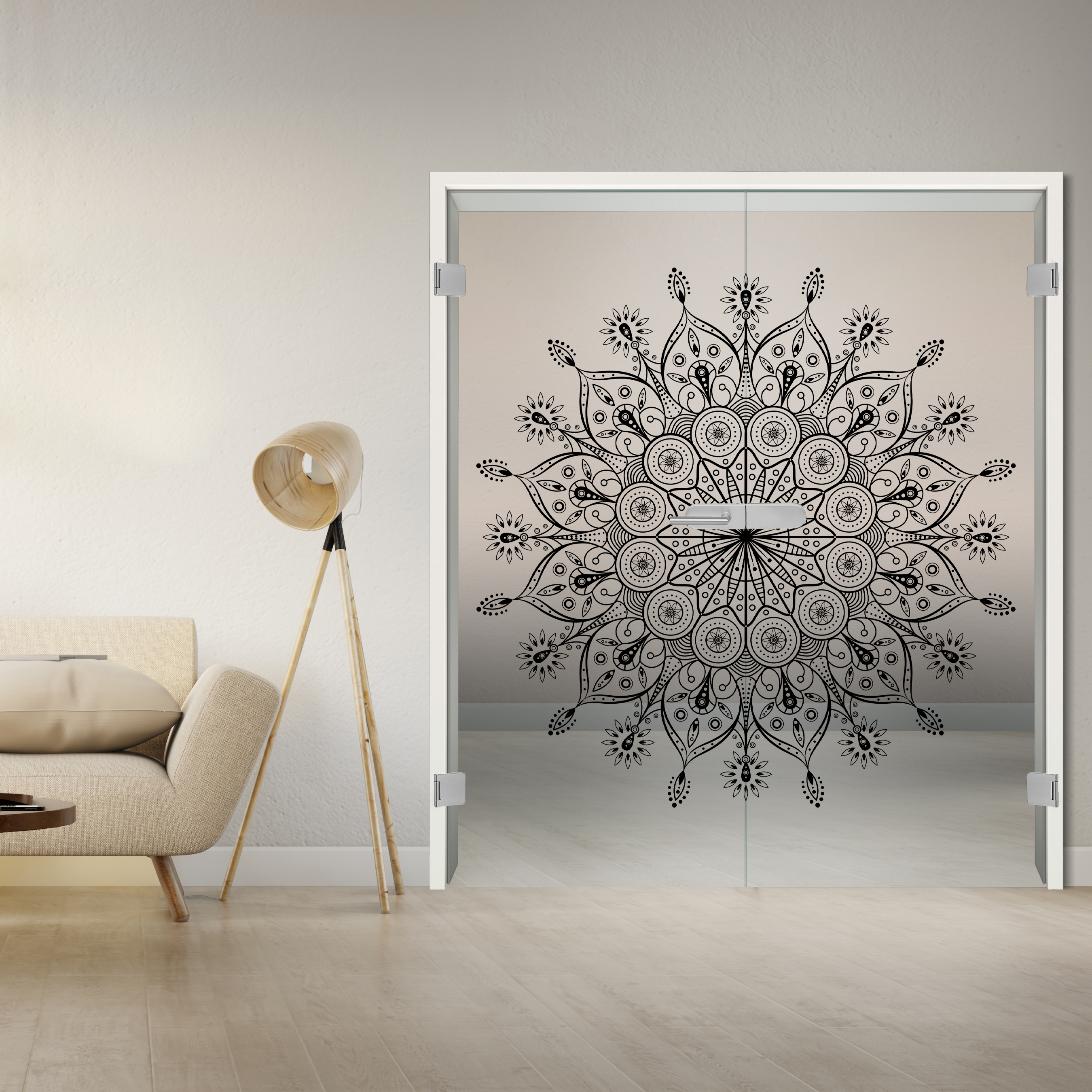 Entscheiden Sie sich für ein lichtdurchflutetes Wohnambiente: Wir haben mit dieser Doppelflügeltür ein hoch modernes Stilelement geschaffen, das Ihr Zuhause perfekt in Szene setzt. Die Klarglas Ganzglastüre vermitteln hochwertige Qualität und passt sich zeitlos an Ihren Einrichtungsstil an. Der edle Digitaldruck in symmetrischer Form auf beiden Flügeln erzeugt einen klaren und exklusiven Look - in der Gesamtheit ein wunderschönes Mandala. Das Dekor erzeugt dank der edlen Verarbeitung einen absoluten Hin-schau-Effekt.
