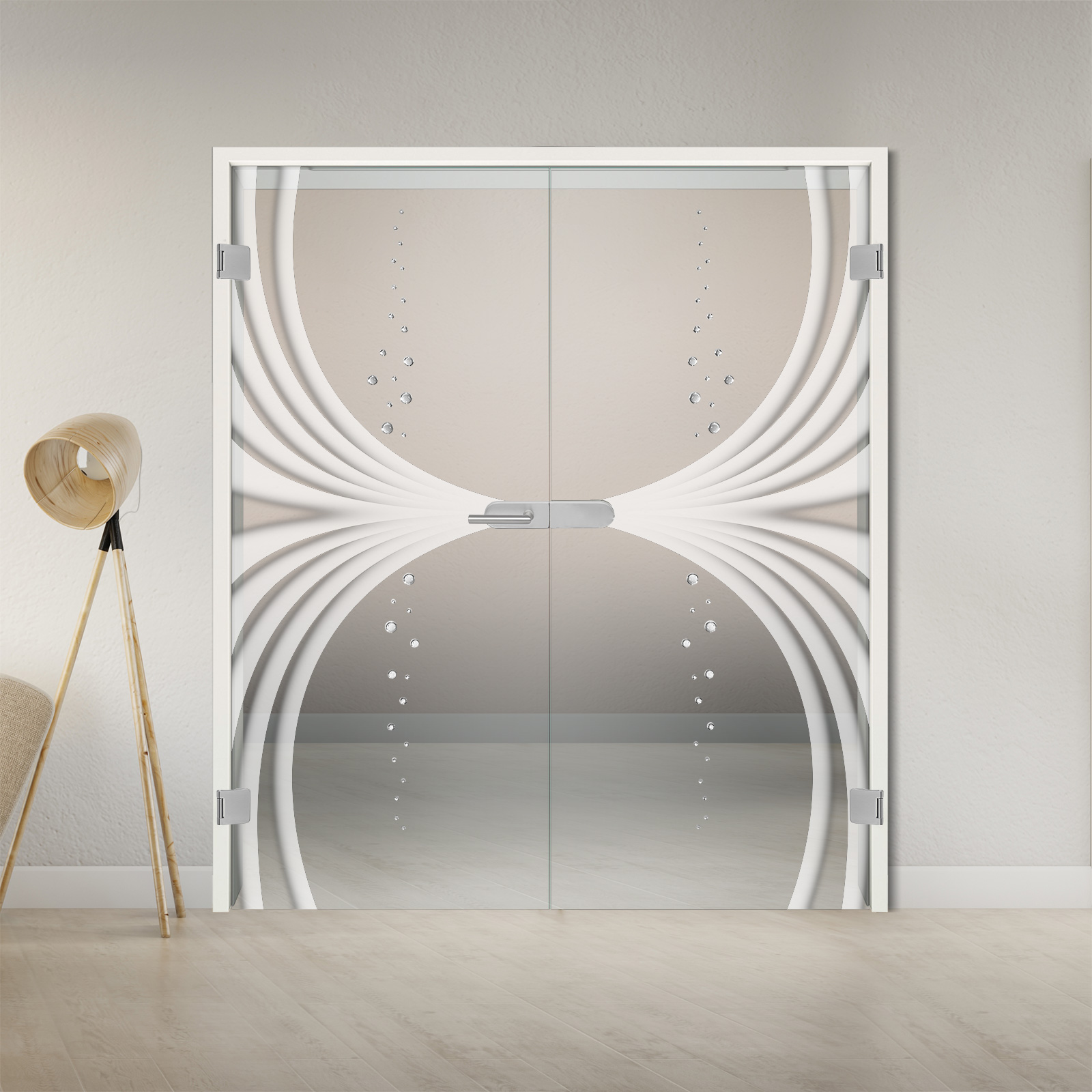 Lichtdurchflutetes Wohnambiente schaffen, mit den Doppelflügeltüren von Glastueren24: Unsere Produktgestalter haben hier mit dieser Doppelflügeltür ein klassisches Stilelement geschaffen, das Ihr Zuhause perfekt in Szene setzt. Die Klarglas Ganzglastüre vermitteln hochwertige Qualität und passt sich zeitlos an Ihren Einrichtungsstil an. Das edle Sandstrahldekor mit Schattierung in Verbindung mit aufgesetzten Schmucksteinen erzeugt einen klaren und exklusiven Look. Was sehen Sie in diesem Dekor? Einen Wasserfall oder Wellen? Die faszinierende Ausstrahlung dieser Doppelflügeltür steckt im Detail: die hochwertige Verarbeitung durch die professionelle Sandstrahlung sorgt für einen besonders harmonischen Lichteinfall. Das Dekor erzeugt dank der edlen Verarbeitung einen absoluten Eyecatcher-Effekt.