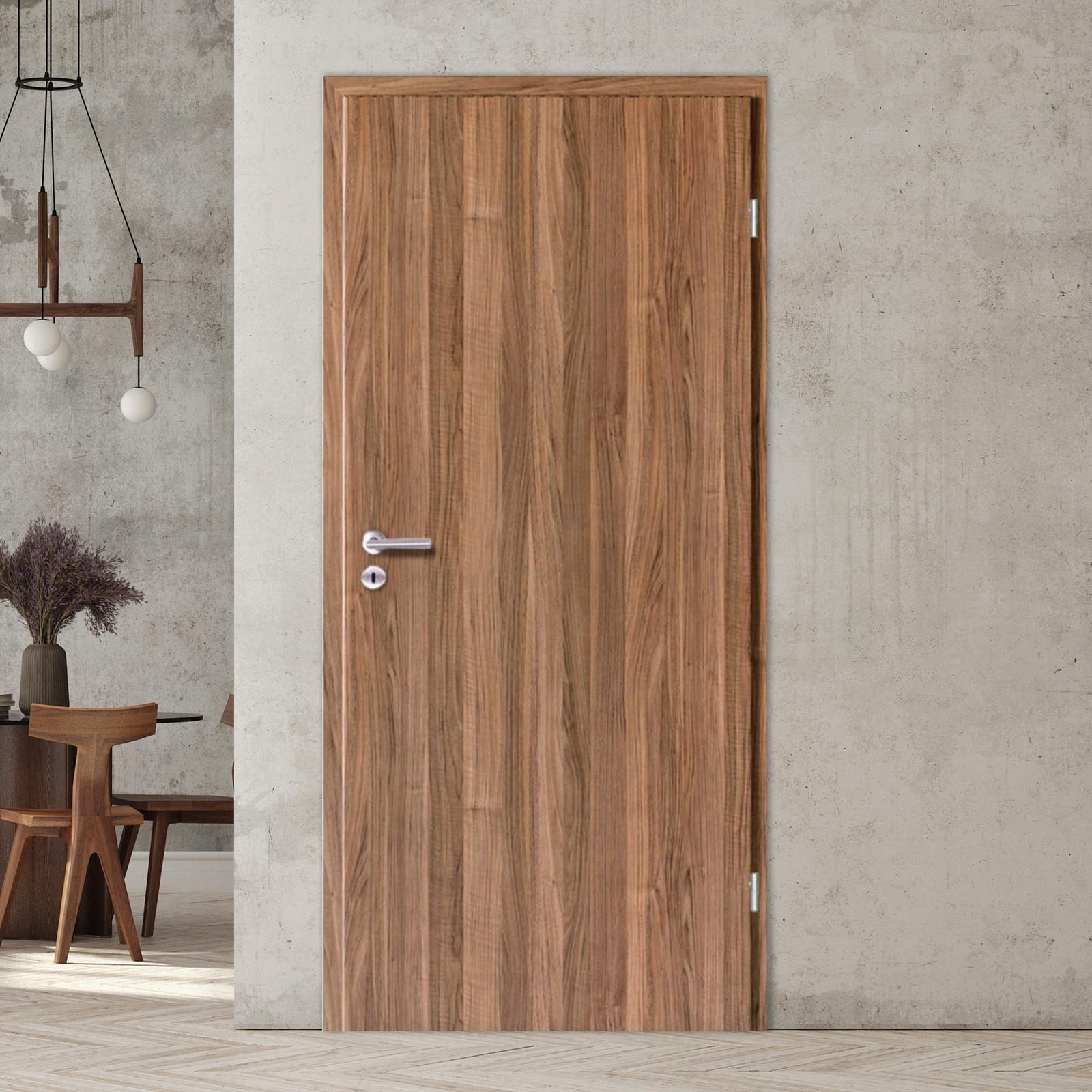 Stilvoll und zuverlässig: Ein minimalistisches Design in Form eines glatten Türblatts wird bei dieser Zimmertür aus dem Hause Lebo mit der naturnahen Lebolit Premium Nature Nussbaum Optik kombiniert.