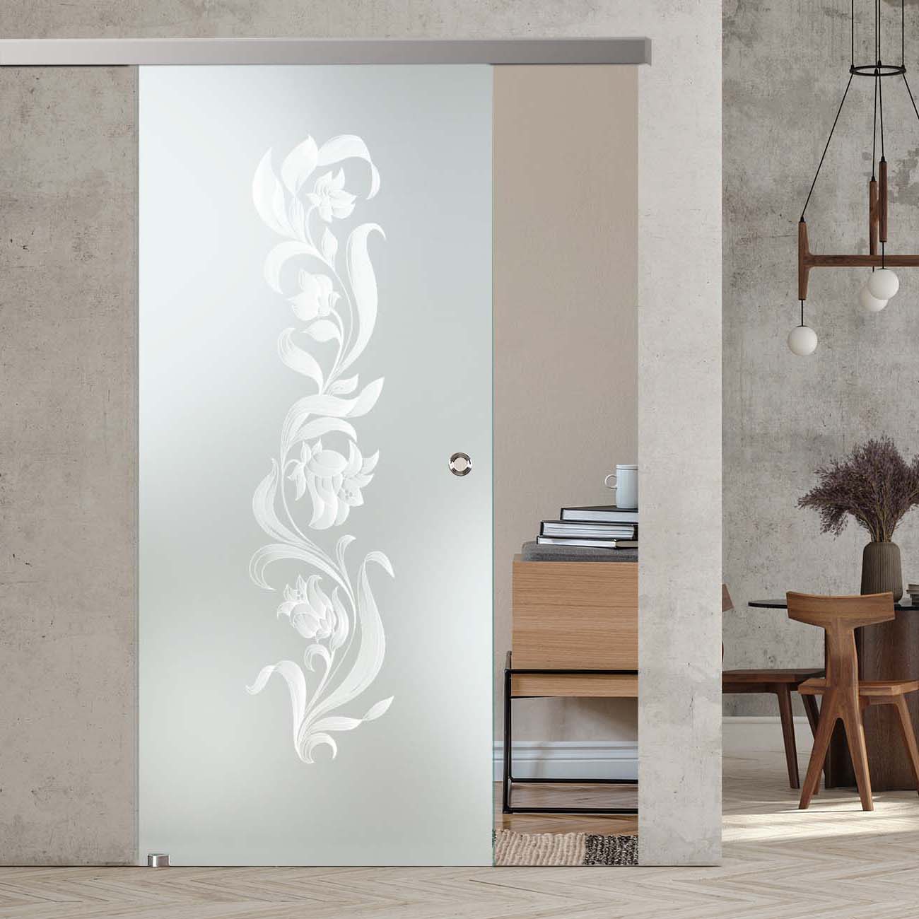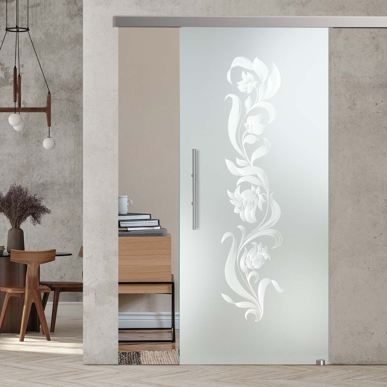 Die Sandstrahlung 230 überzeugt durch ihr ästhetisches Sandstrahldekor, welches teildurchsichtig ist. Diese Designglastür ist geschmückt mit einer Blumenranke. Dieses florale Muster fügt sich mühelos als Eyecatcher in Ihre Wohnsituation ein. Egal ob als Bad-, Wohnzimmer-, Küchen- oder Bürotür.