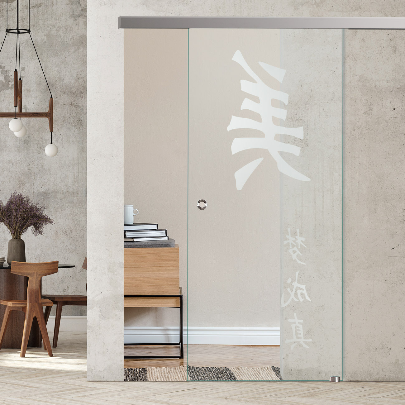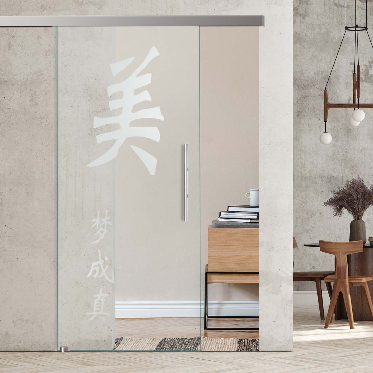 Die Schiebetür 261 ist mit chinesischen Schriftzeichen verziert. Die Schriftzeichen bedeuten „Träume werden wahr“. Lassen Sie Ihre Träume wahr werden und entscheiden Sie sich für die Sandstrahlung 261.