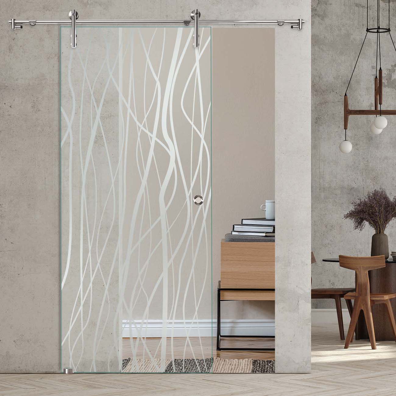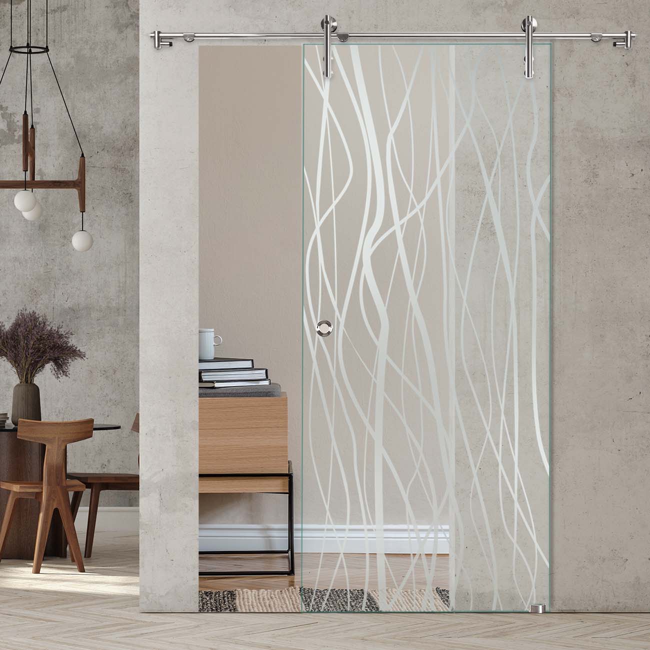 Dieses Sandstrahldekor auf ESG-Sicherheitsglas bringt Extravaganz in Ihr Zuhause. Es passt sich in jeden Wohnstil an und wirkt zugleich elegant und modern.
