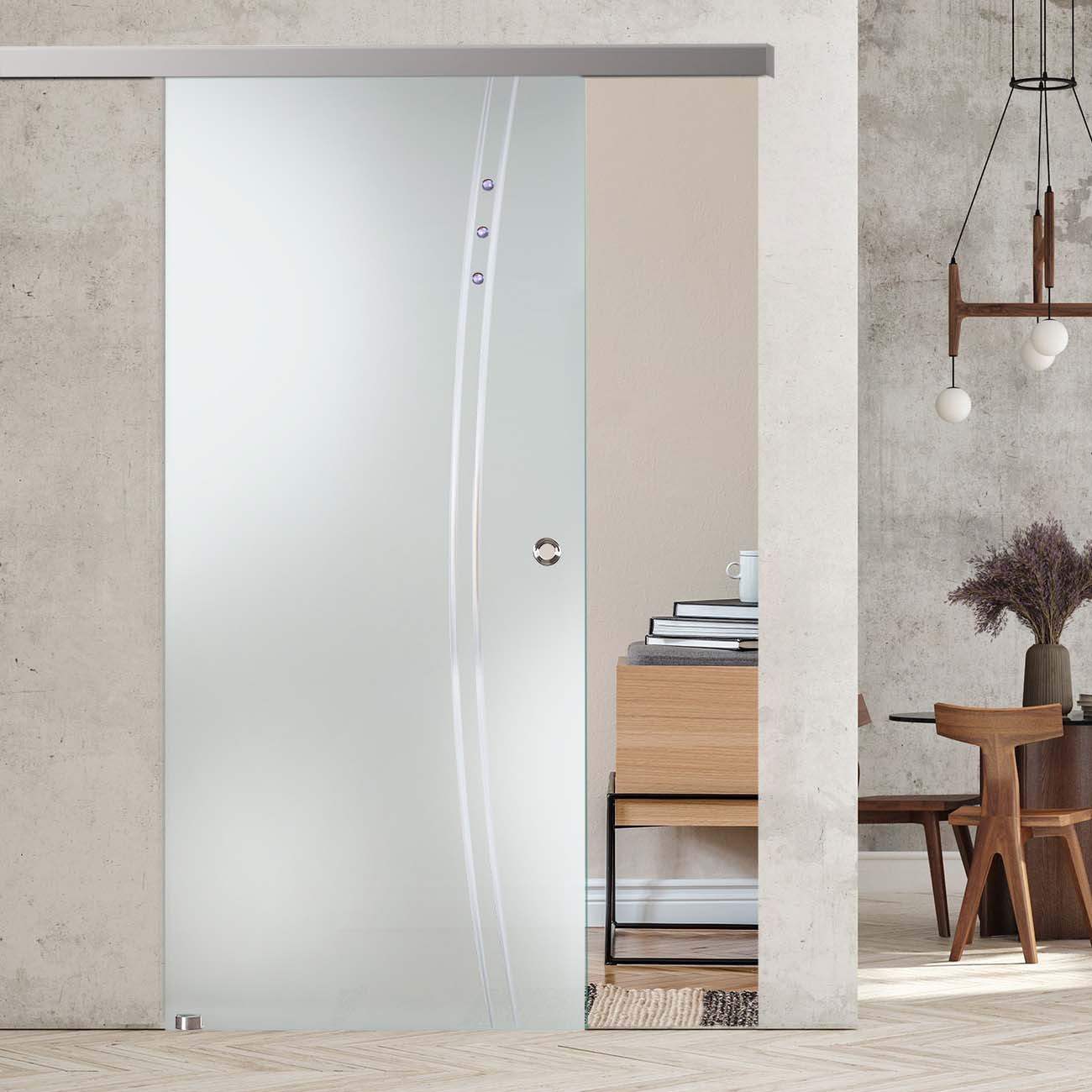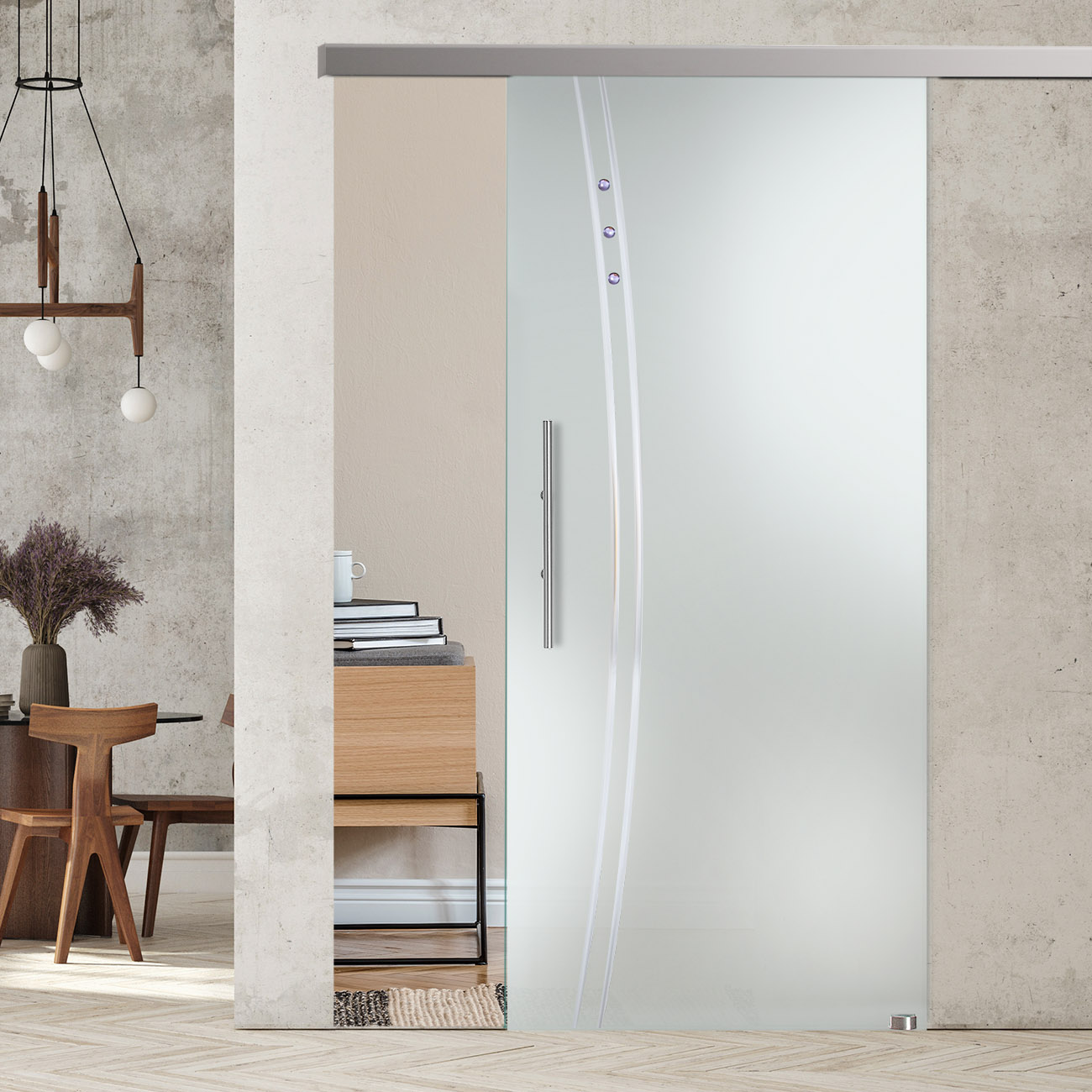 Produktinformationen "Schiebetür "909 S" mit AG50-Schiebesystem, Schmucksteinen und Rillenschliff "
