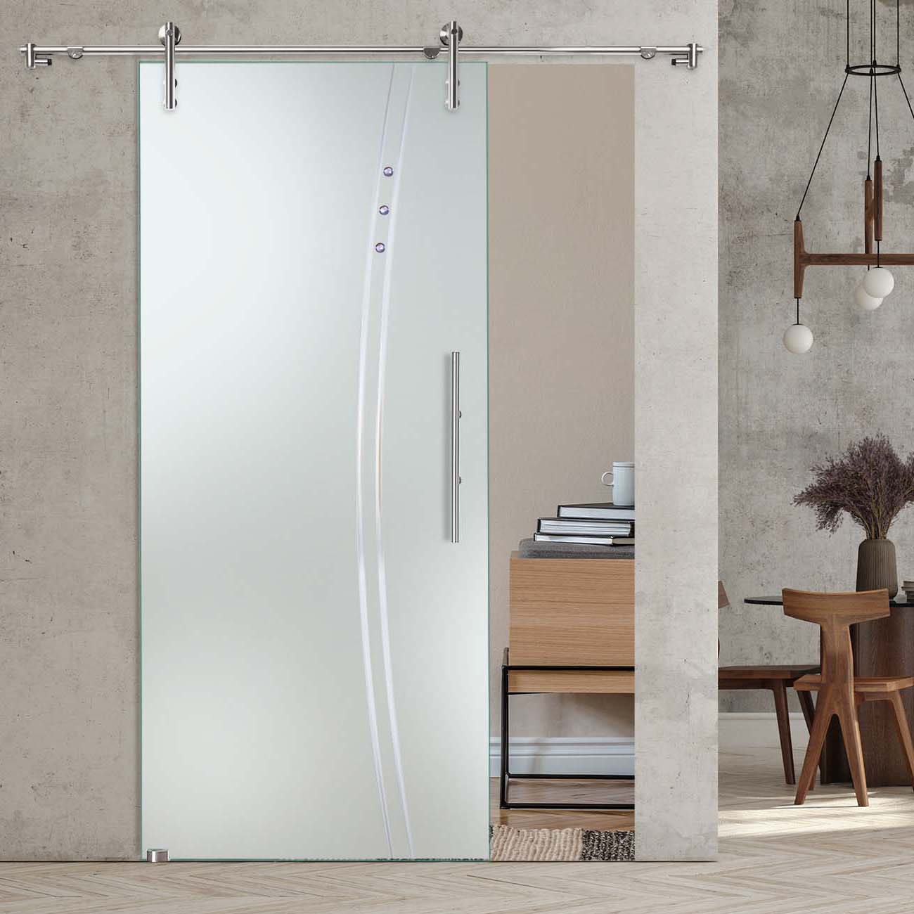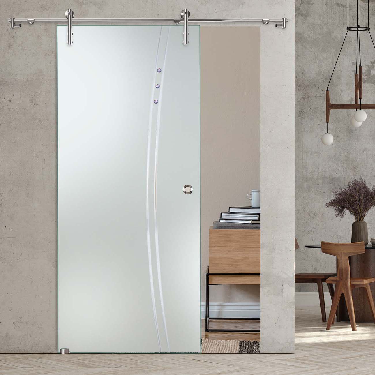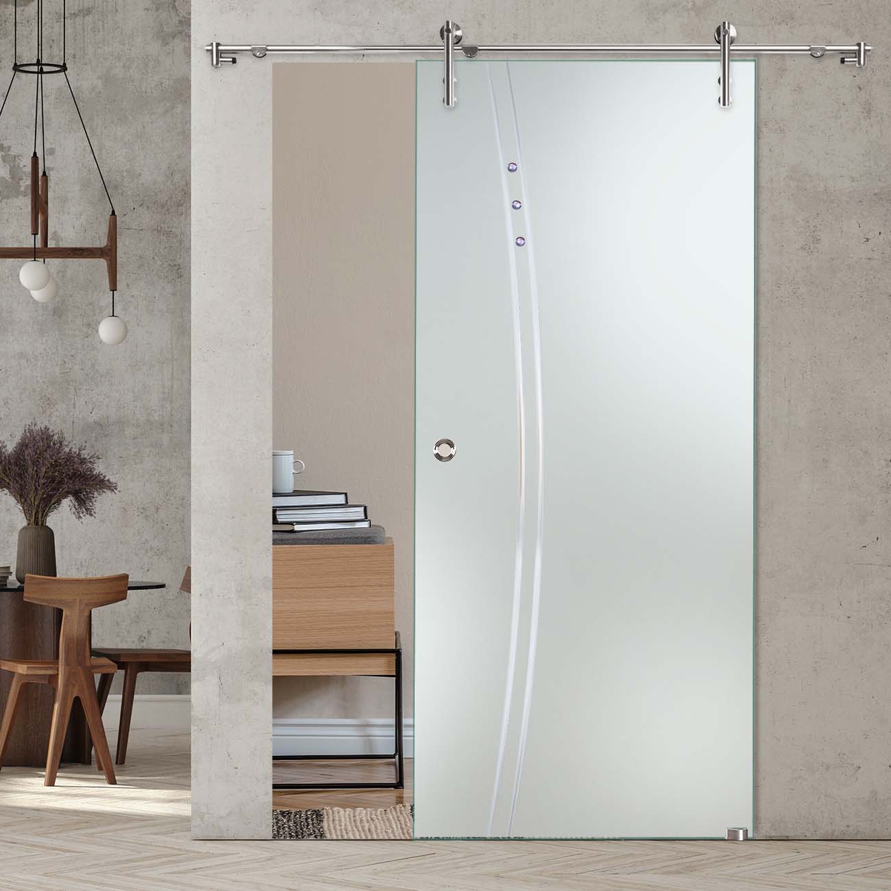 Produktinformationen "Schiebetür "909" mit V1000-Schiebesystem, Schmucksteinen und Rillenschliff "