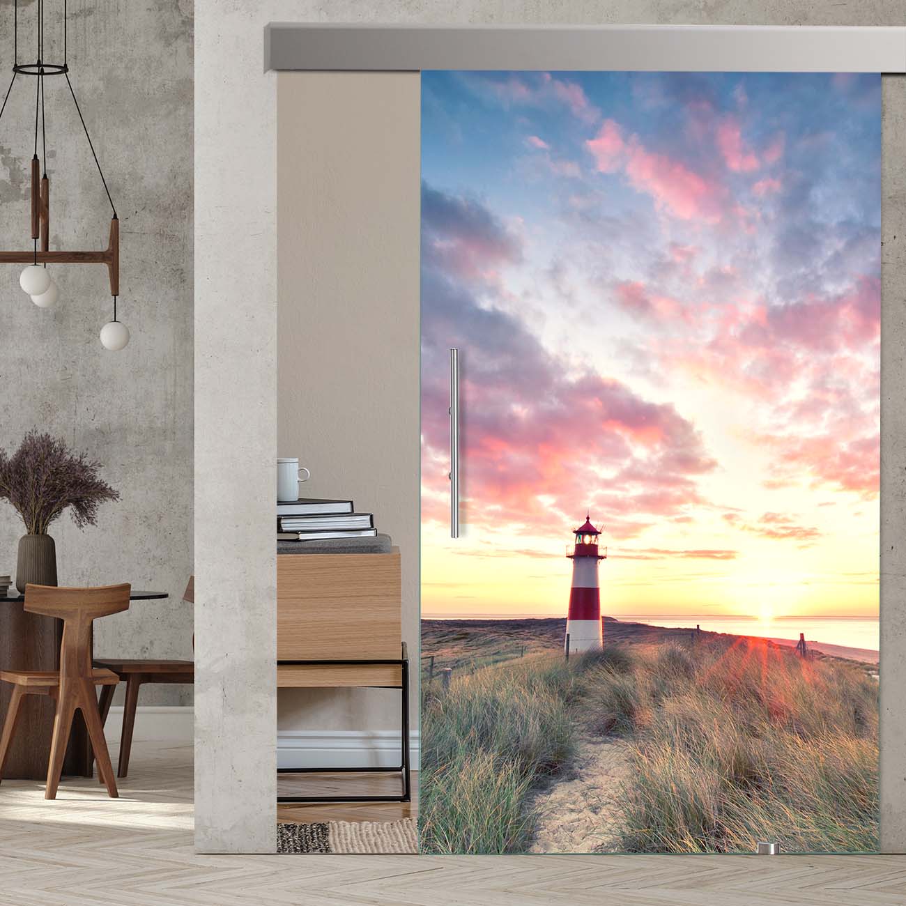 Ein Leuchtturm, auf Dünen im Sonnenuntergang. Das sieht man doch gern. Lassen Sie sich vom Anblick dieser Digitaldrucktür verzaubern und entscheiden Sie sich für einen Leuchtturm der zum Hingucker in Ihrem Zuhause wird. Dieses Dekor lässt trotz des Digitaldrucks Licht in Ihre Räume!