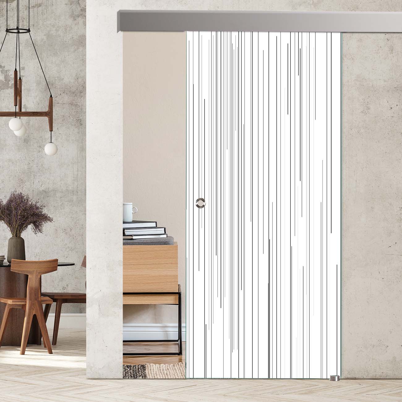 Um Ihnen hier die Möglichkeit der Individualisierbarkeit zu geben gibt es von jeder der Türen 3 Versionen. Zum einen entweder schwarz/weiße Linien um den Charakter des hochwertigen Sicherheitsglases noch mehr zur Geltung zu bringen. Zum anderen haben wir auch eine Version, bei welcher die schwarzen Streifen auf einen weißen Hintergrund gebracht werden. Somit wird die Tür blickdicht. Der Vorteil einer Glastür bleibt jedoch bestehen: selbst die vollflächig bedruckten Türen bleiben lichtdurchlässig und machen Ihren Wohnraum somit heller. Dieses Dekor wird in die Ansicht gedruckt.