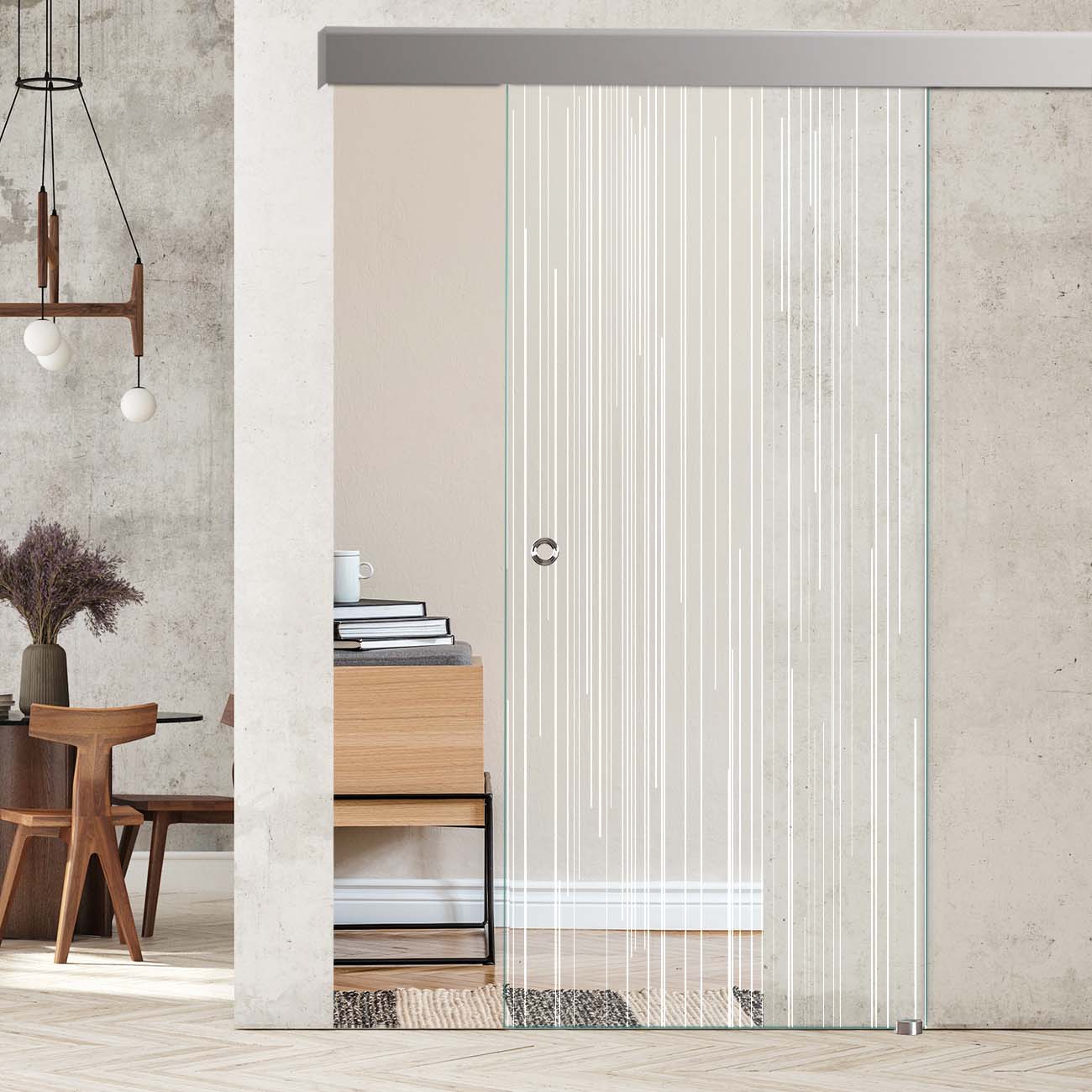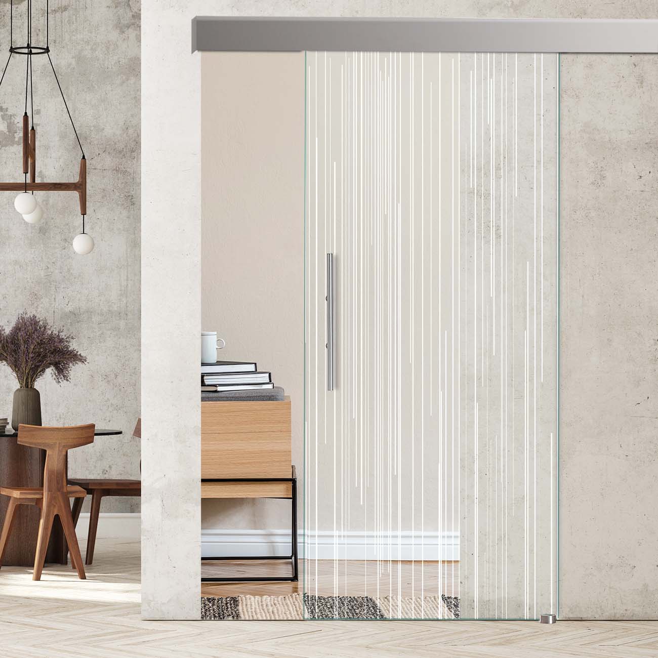 Um Ihnen hier die Möglichkeit der Individualisierbarkeit zu geben gibt es von jeder der Türen 3 Versionen. Zum einen entweder schwarz/weiße Linien um den Charakter des hochwertigen Sicherheitsglases noch mehr zur Geltung zu bringen. Zum anderen haben wir auch eine Version, bei welcher die schwarzen Streifen auf einen weißen Hintergrund gebracht werden. Somit wird die Tür blickdicht. Der Vorteil einer Glastür bleibt jedoch bestehen: selbst die vollflächig bedruckten Türen bleiben lichtdurchlässig und machen Ihren Wohnraum somit heller. Dieses Dekor wird in die Ansicht gedruckt.